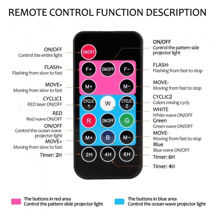 【A Matched Remote Control】There is a remote control matched this projector lamp with enough button to control it, such as ON/OFF, FLASH+, Motor+, CYCLIC1, Red, Timer, etc. Very convenient to use.