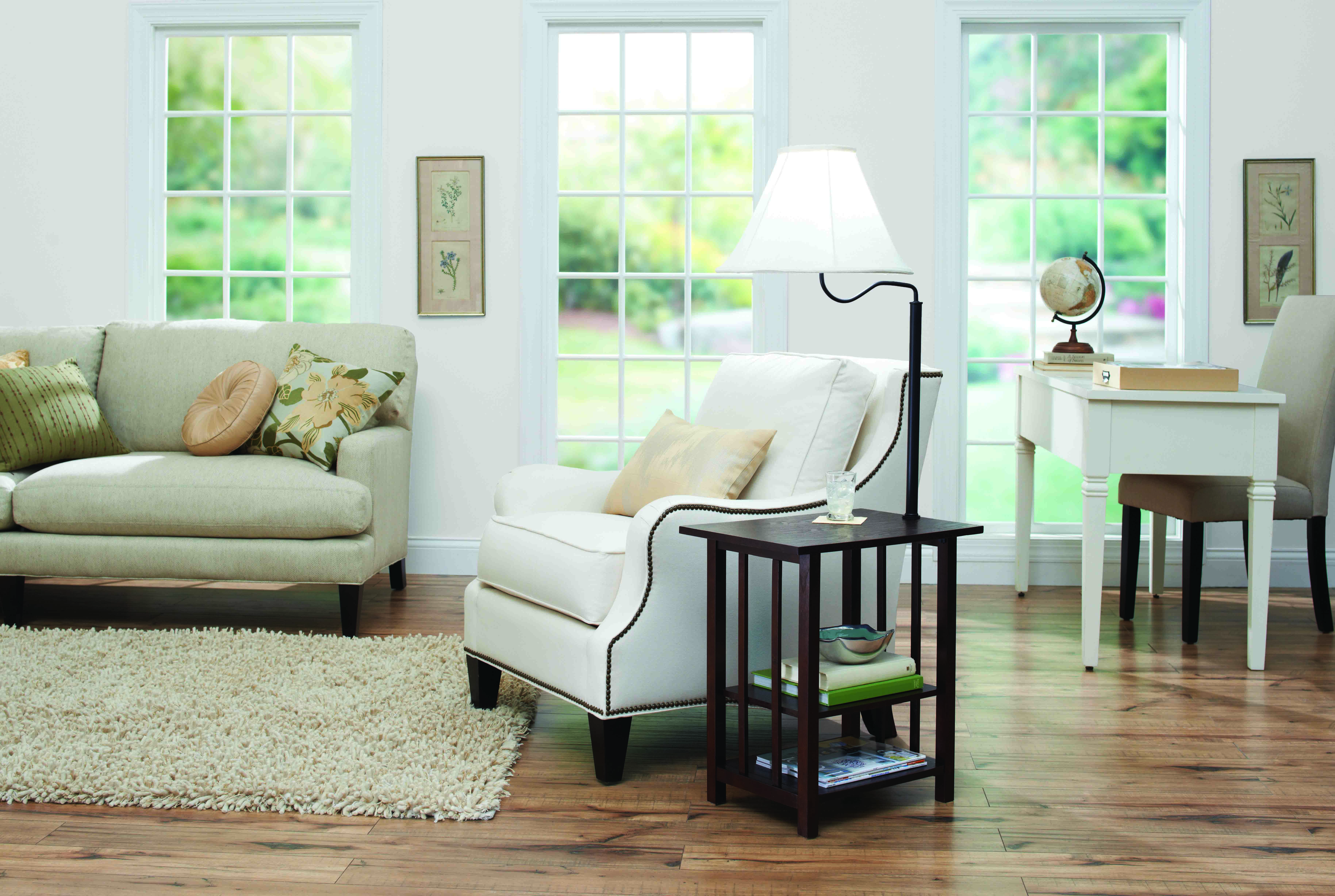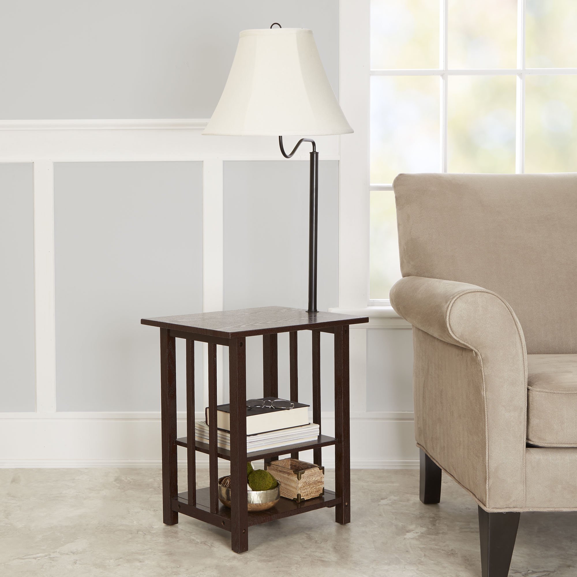 The Better Homes & Gardens 3-Rack End Table Floor Lamp is a great way to add functionality and value to a small area of your office or living space. This item features a swing-arm lamp to optimize visibility and light distribution wherever you are in the room and the two enclosed shelves offer a great solution for storage and organization. With a rich, espresso finish and a neutral lamp shade, this piece is sure to blend well with a wide variety of home-decor styles. Get style and versatility with the Better Homes & Gardens 3-Rack End Table Floor Lamp.